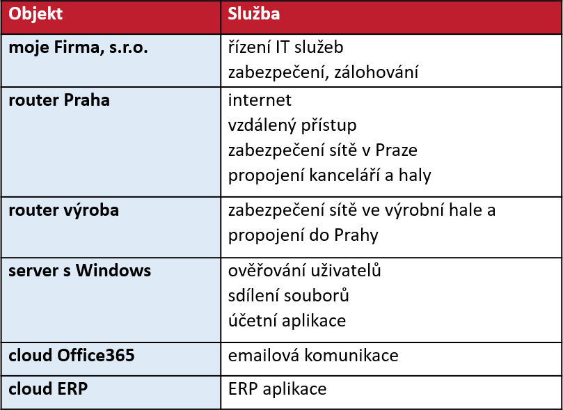 Vedení firmy zmapovalo procesy, které zaměstnanci rutinně vykonávají a usoudili, že od IT očekávají následující služby: